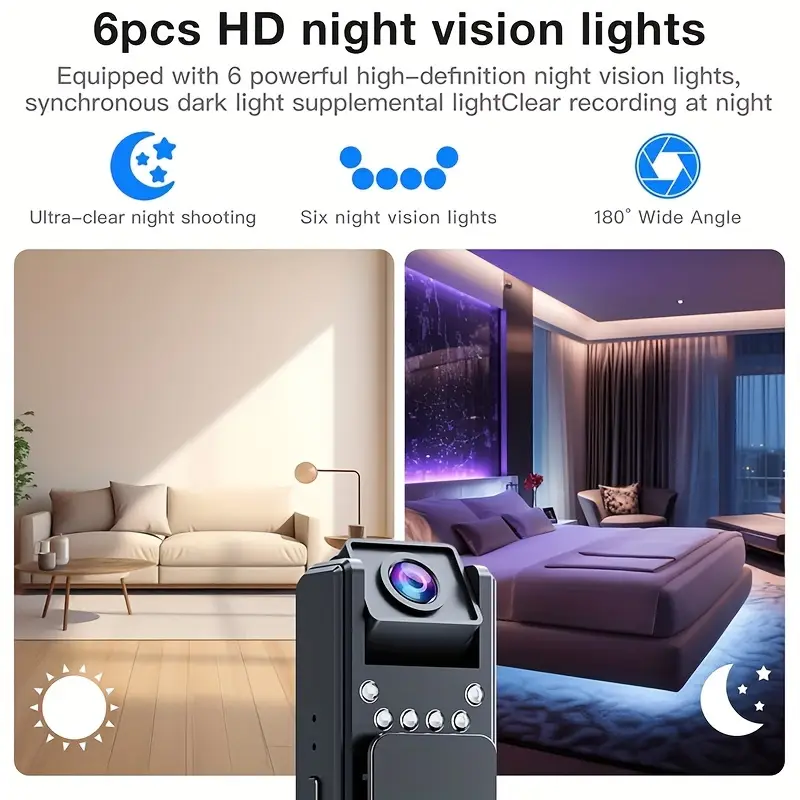 Capture high-quality footage anytime, anywhere with this Mini 1080P HD Action Camera, designed for patrol, security, sports, and pet recording. Featuring infrared night vision with 6 infrared light beads, this compact camera delivers clear visibility in low-light conditions. The 180° rotating lens allows for versatile shooting angles, while the fixed focus and automatic exposure ensure seamless operation.